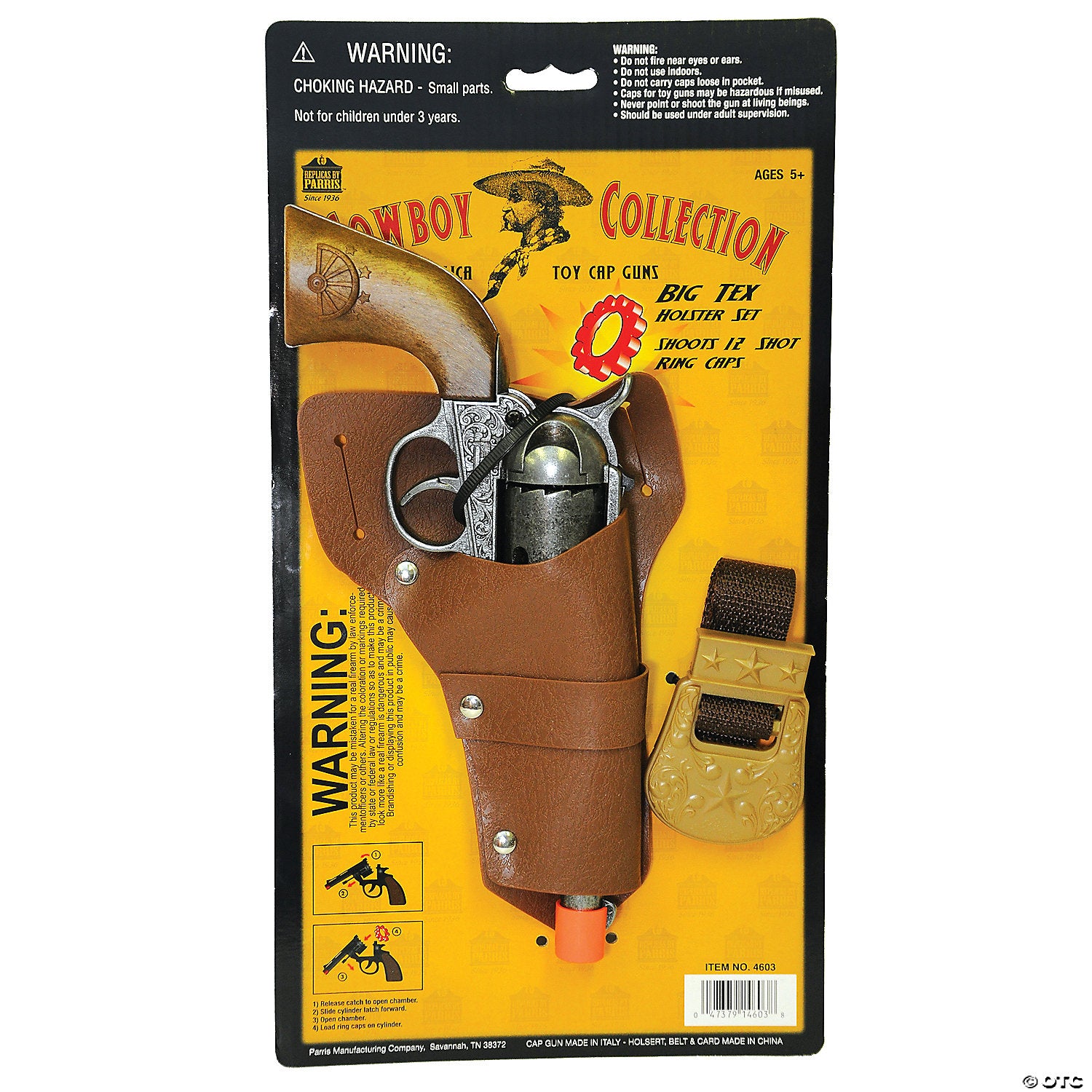 This is a Big Tex Holster Set 12 Shot Cap Gun from Parris Toys, that is made from the original Gonher Cowboy Revolver molds. This is from the Cowboy Collection of replica toy cap guns. Measures 10.5" long overall, with a 5" barrel. This replica gun contains the colored markings required by law, including a permanently attached orange plug.