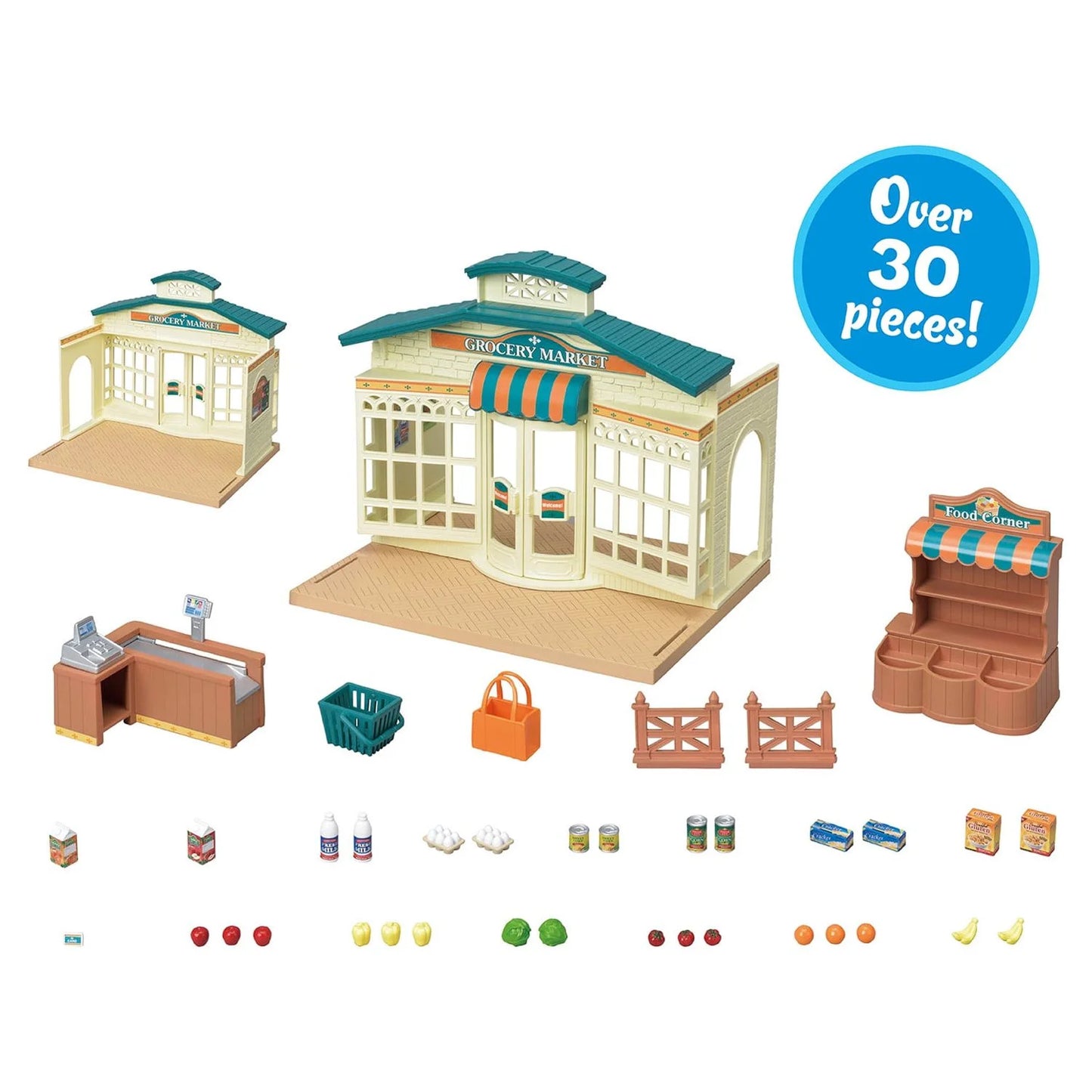 Calico Critters miniature dollhouses, playsets and figures are timeless and classic high-quality toys. Shop for fresh fruits, vegetables, drinks & more at the Grocery Market! This set includes over 30 pieces including food stand with milk, juice, eggs and produce, shopping basket and bag, cash register and checkout counter with a working conveyer belt! Connect to the Village Pizzeria to create Main Street in Calico Village, a place where families can gather to dine and shop!