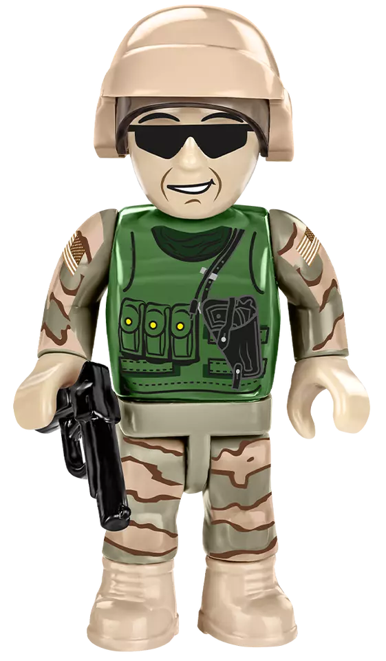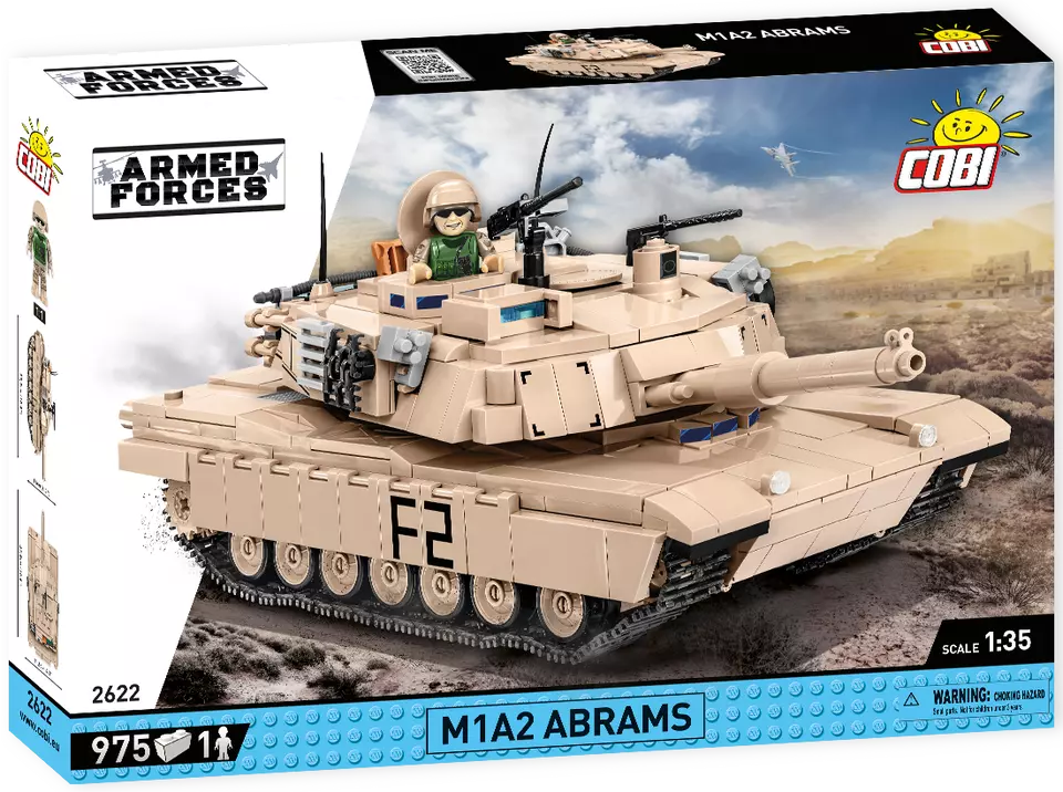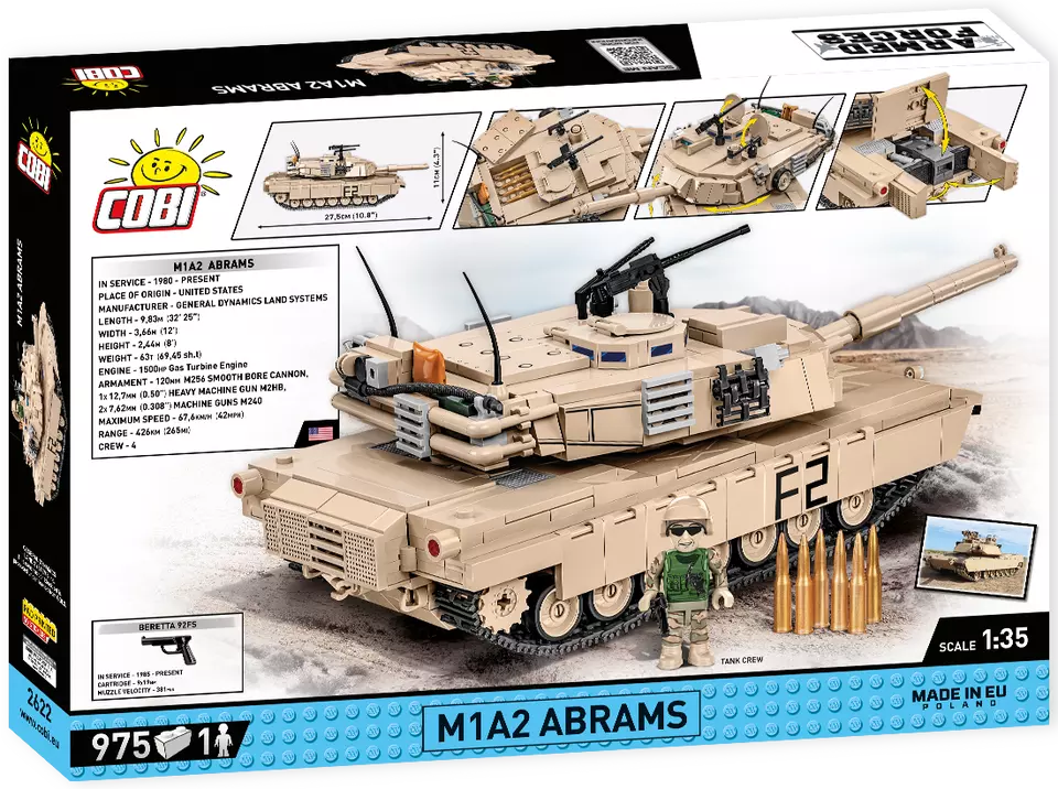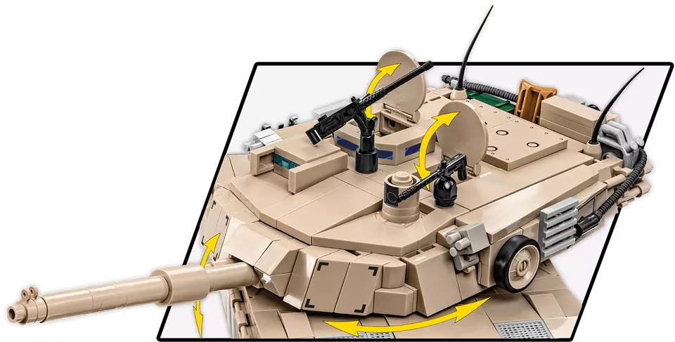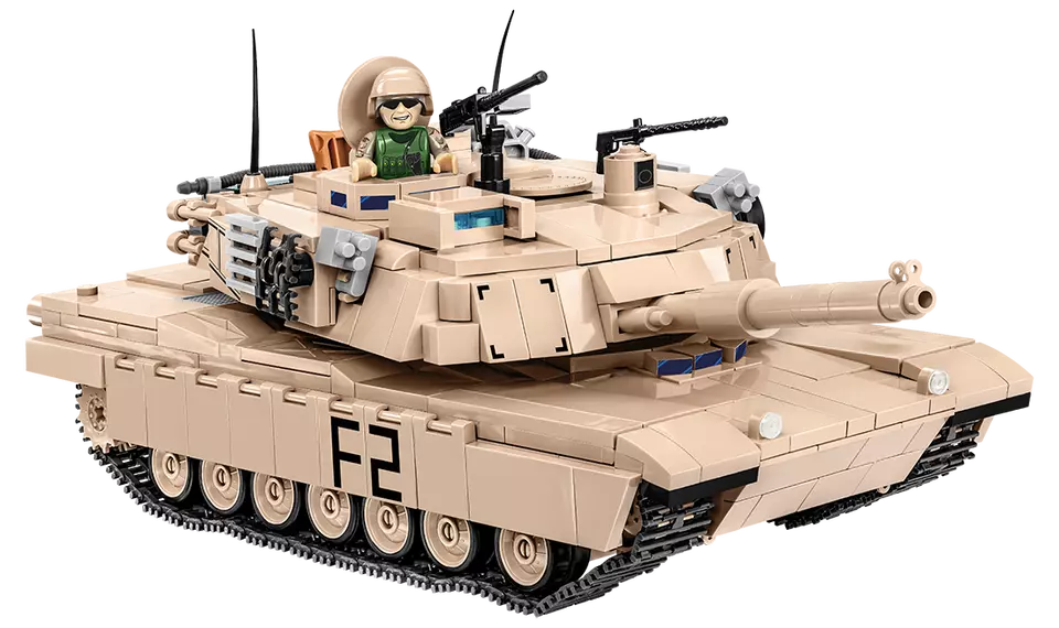 From this set of COBI construction blocks you can build an Abrams tank in the M1A2 version, developed under the license of General Dynamics Land Systems. The model was reproduced in a sensational scale of 1:35. The latest version of this cutting-edge tank is even more detailed. It became possible thanks to the use of new blocks from the ever-growing catalog of elements created by COBI. The model has only high-quality prints that do not wear off during use. The vehicle has working tracks and opening hatches to place the crew. The vehicle's turret and barrel are movable. Under the removable service hatch there is an engine modeled from bricks. The Abrams tank has been enriched with accessories such as: a block sack, spare tracks, ammunition and two machine guns. The set includes a very interesting figure of an American tanker equipped with a personal pistol.