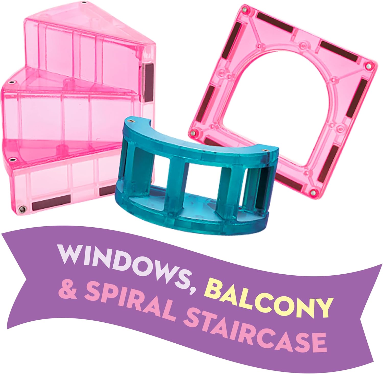 - What’s Included: 25 magnetic pieces, including 1 Drawbridge, 1 Dragon Figure, 1 Royalty Figure, 1 Spiral Staircase, 1 Balcony, 2 Windows, 2 Equilateral Triangles, 2 Quarter Circles, 4 Isosceles Triangles (2 Glitter, 2 Standard) and 10 Squares (4 Glitter, 6 Standard). What Makes It Unique: Includes our first working Drawbridge, Spiral Staircase and Balcony, exclusive Dragon and Royalty figures, redesigned Windows for enhanced storytelling and imaginative play.