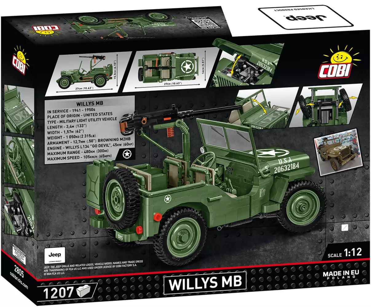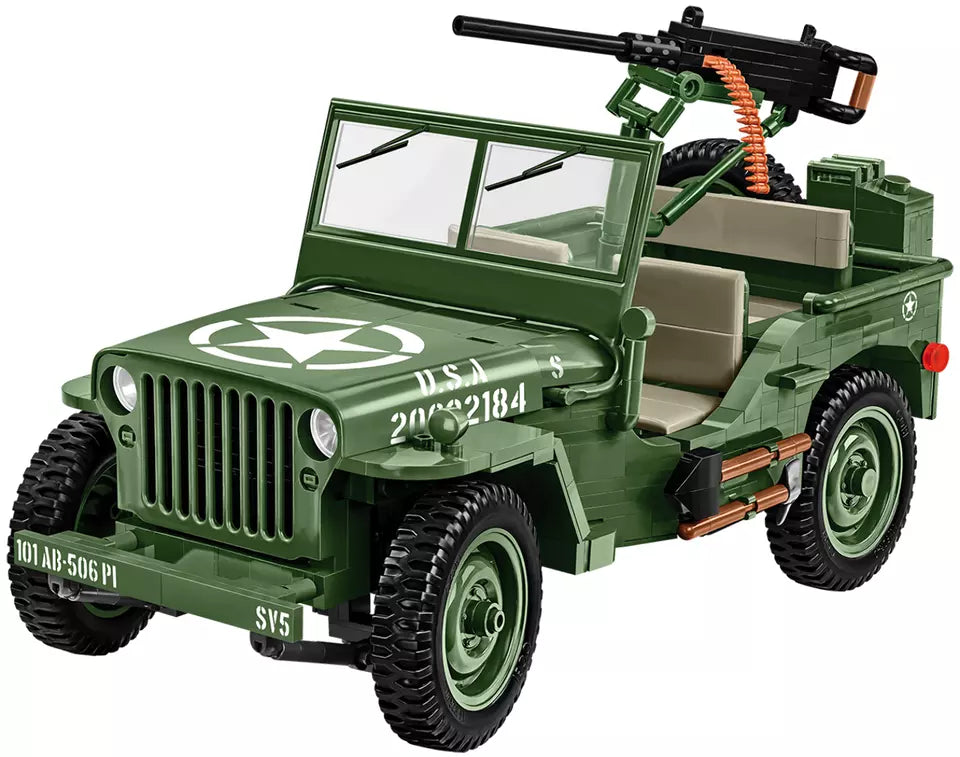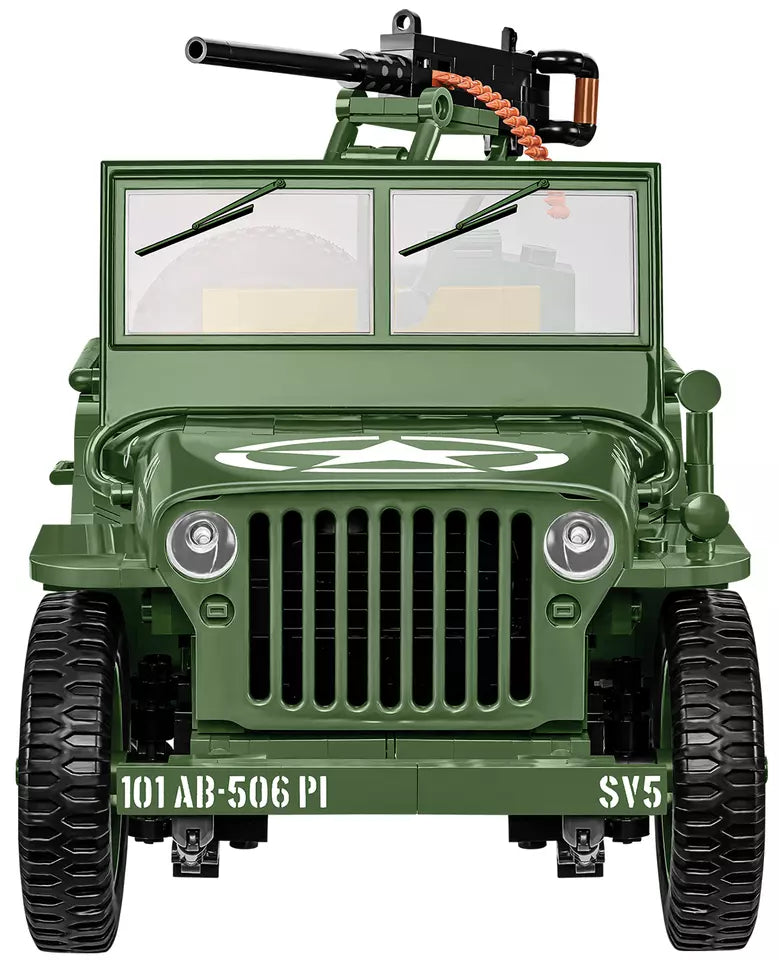 The licensed Willys Jeep was released as an advanced 1:12 scale model and fits perfectly into the celebration of the 80th anniversary of the Allied landings in Normandy! The world's most popular off-road vehicle was carefully designed using COBI construction blocks and consists of 1,207 elements. Completely new elements with details reflecting the appearance of the historic car were created especially for this set. The huge block Willys MB has a characteristic grill and hood, realistic turning wheels, a working steering wheel, interior details and a reproduced engine. The brick vehicle is equipped with a heavy machine gun and brick gasoline cans that can be attached to the back. The wheels with rubber tires rotate and turn and can be moved while playing. The blocks feature high-quality prints with historical markings of a vehicle that served in the 101st Airborne Division of the United States Army. A historic vehicle from 1944 painted in exactly the same way is owned by COBI and was uséd as a model for this wonderful collector's set! The set also perfectly complements our very rich Historical Collection WWII series! Build history, piece by piece, with COBI.